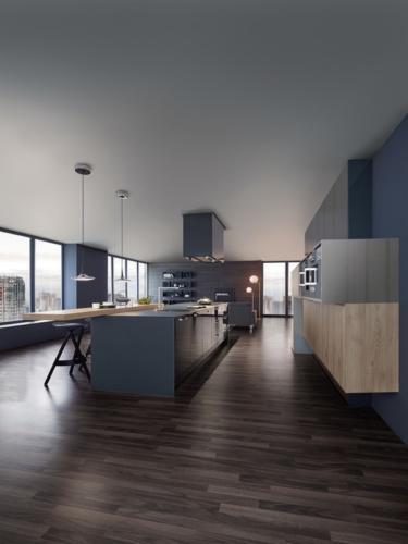 Clearly structured and ingenious: across from the functional run in a three-dimensional composition, there is an island with a slightly overhanging worktop and matching bar stools underneath. The island front, facing the room, features a highgloss lacquer surface which discreetly reflects the surroundings – a further subtledetail in the transition from kitchen to living area. A very elegant ensemble in dark shades. The focus is on the functional run, attached to the wall, with elements of different depths and materials – a different, rhythmic kitchen architecture. The highgrade genuine wood with its characterful structure is a fine touch – and also features on the high-class inside.